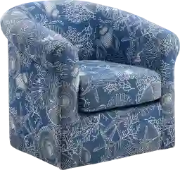 Constructed on a wood frame, the swivel barrel Tanith chair strikes a classic silhouette with an arched back, flared track arms and a thick padded seat. Baltic denim blue creates an inviting background color for subtle coastal repeat pattern that will blend into virtually any decor. The fabric content is polyester. The Tanith is a perfect accent for your living room, den or beach home. Swivel action is added to conveniently allow you to focus in any direction. In addition, the cushion is loose and the seat dimension is 19.5W x 21D. Customer assembly is required.
