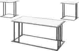 Bring a fresh urban style to your living space with this unique, modern Tavistock 3 piece coffee table set. The table tops are finished in a chic white laminate and framed in a solid silver metal base with a contemporary design. The rectangular coffee table with a spacious surface is just the right size for compact spaces and the matching square topped side tables can easily hold a pair of lamps or decorative objects. The simple minimalist style of this table set will anchor your living room or family room to perfection! Customer assembly is required.
