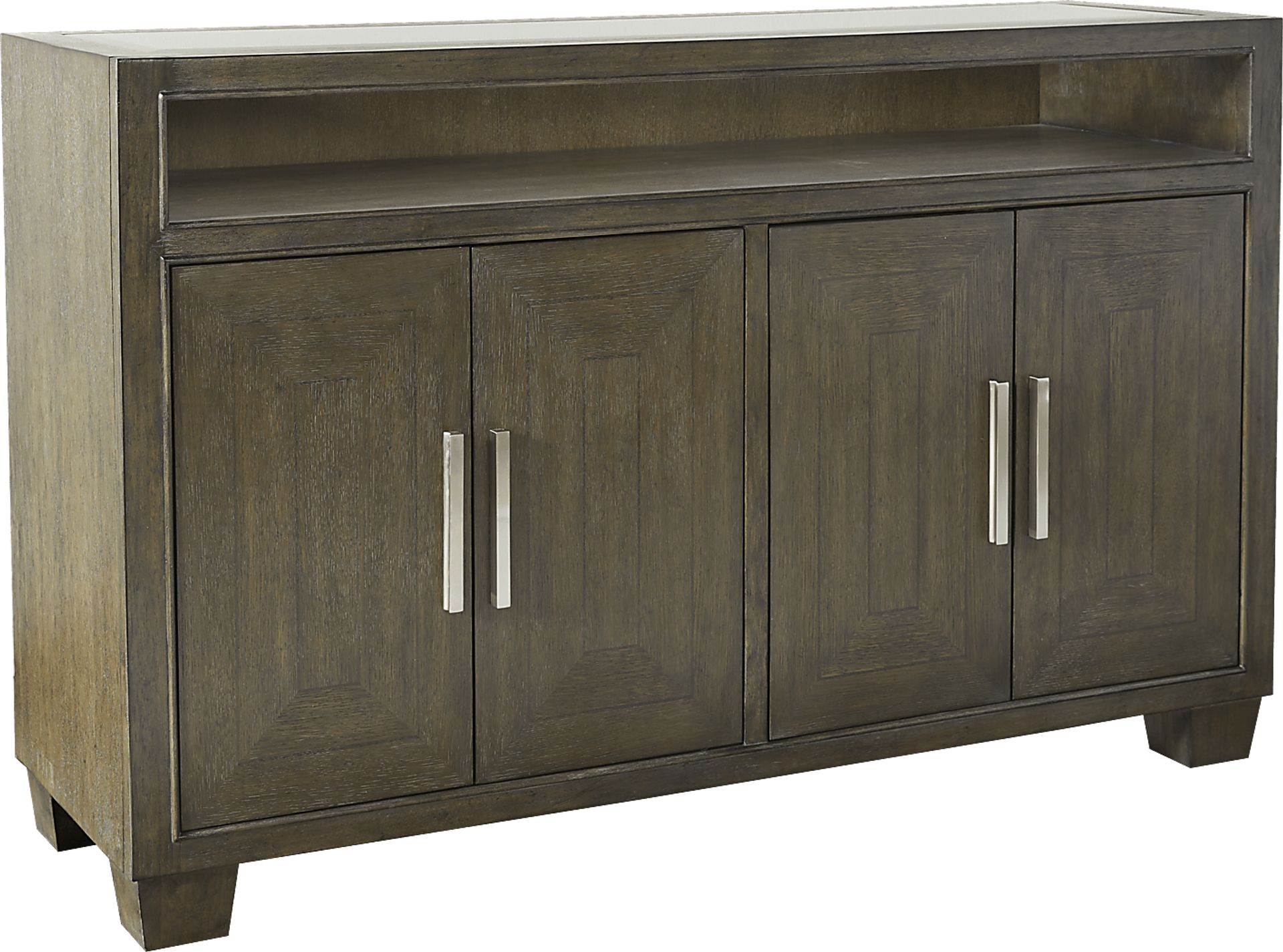 Serving up contemporary style and practical storage, the Taylor Trace credenza is the ideal addition to your dining room. The smooth glass top surface is perfect for serving pieces while the long open shelf below accommodates plates, napkins or anything else you'd like to keep within easy reach. Additional storage includes an adjustable shelf behind the doors on the left while three drawers are located behind the doors on the right. Each drawer is crafted with English and French dovetail joints for strength and stability. Made with wood solids and 1/4 cut oak veneers, the credenza has bar-shaped hardware with a nickel finish that contrasts beautifully with the server's rich brown finish.