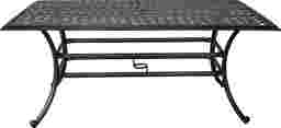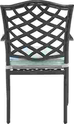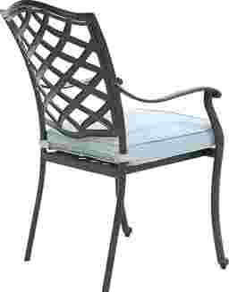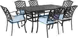 If you are looking to make the most of your outdoor space, start with the Telese Espresso 7 Pc Outdoor Rectangle Dining Set. This seven-piece outdoor dining set includes six arm chairs with blue seat cushions and a rectangle dining table. Made from heavy cast aluminum, this sets offers reassuring durability and a polished look to your home. The lattice design of the chair backs echoes to the table top, which makes the set perfect for turning your patio into a great place to host your dinner. Customer assembly required. The aluminum frame is finished with a high UV-resistant powder coating. The seat cushions are covered in fade resistant 100% solution dyed polyester fabric. To clean use a sponge or soft brush to apply a mild soap and warm water solution to the fabric, rinse thoroughly, and air dry.