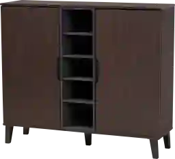 Easily organize your entryway with the generous shelving of the Telford accent cabinet. Constructed from sturdy wood in a sleek, modern two-tone walnut brown and grey finish. Five open shelves and ten enclosed shelves provide ample space to store up to 25 pairs of shoes. Dark brown splayed legs add a touch of retro charm, while cut-out handles lend a contemporary look. This cabinet is the prime choice for displaying the finest shoe collections. Customer assembly is required.