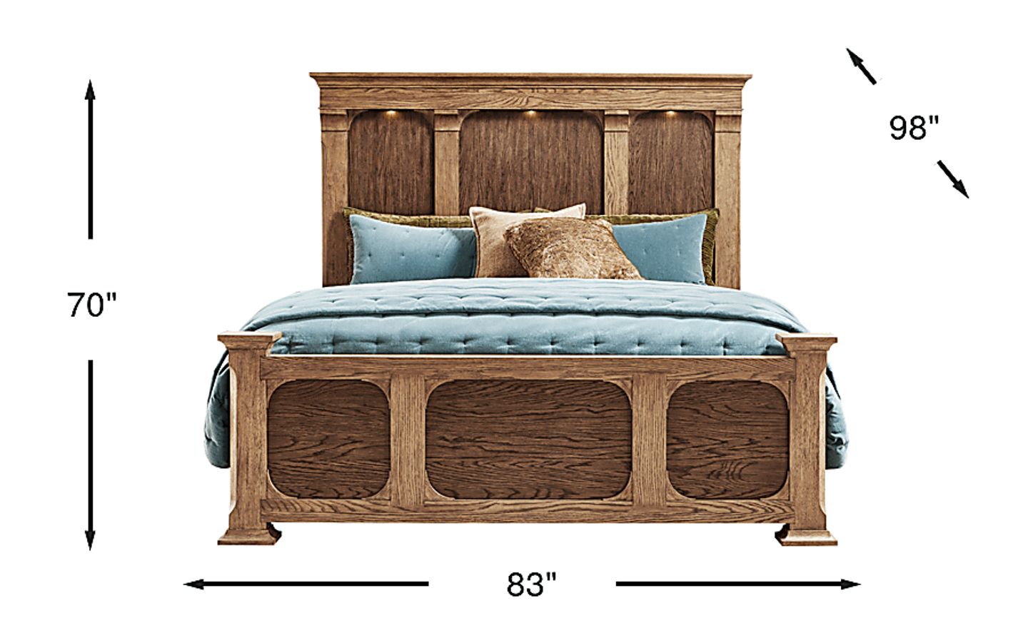 This bed features a grand 70-inch tall headboard, designed to be a commanding focal point. While it fits comfortably under standard 8-foot (96-inch) ceilings, we suggest measuring your vertical clearance if you have low-hanging ceiling fans, chandeliers, or deep crown molding. This ensures that the decorative cove molding and pillars have enough visual "breathing room" to maintain the room's proportions.