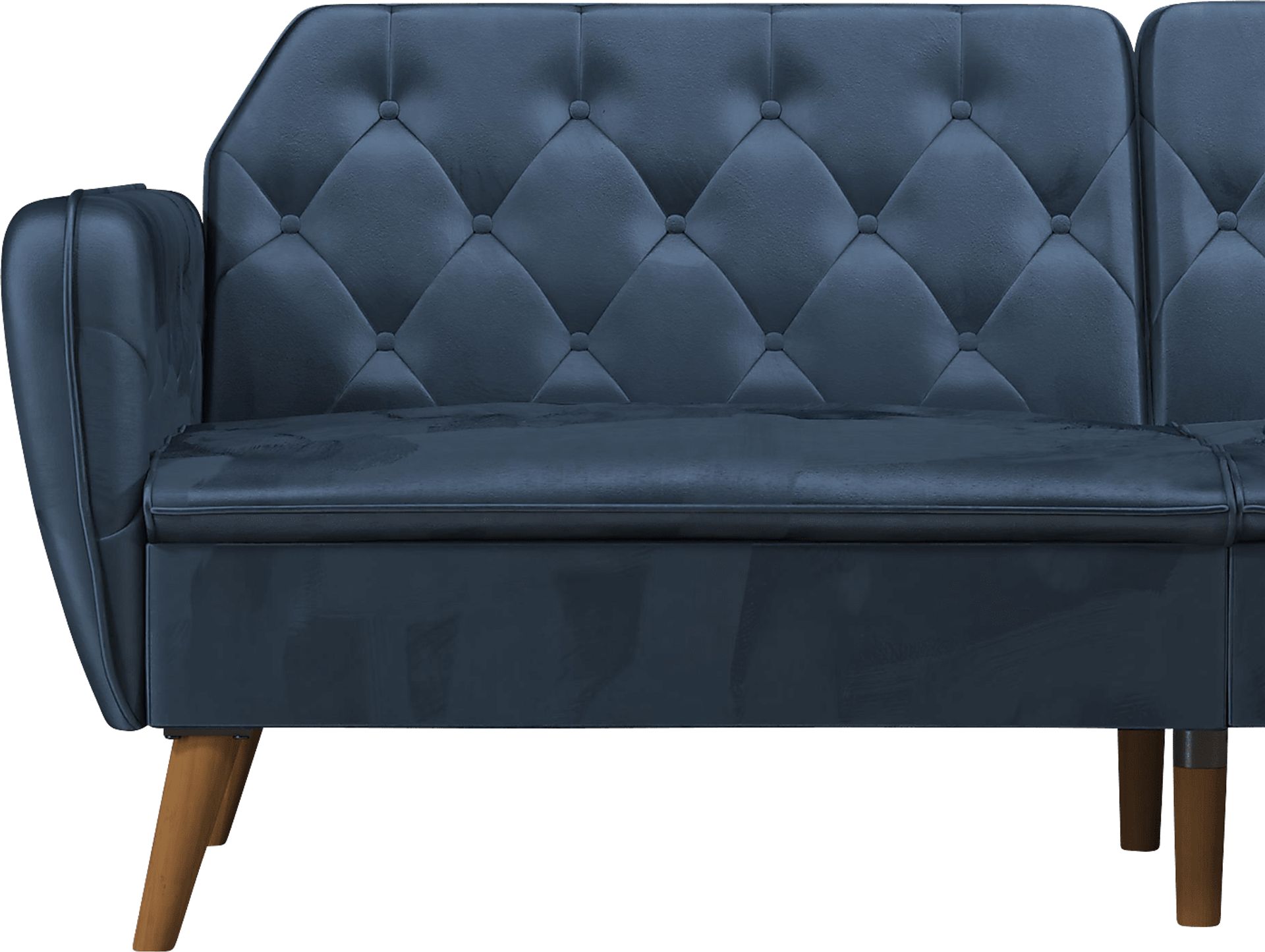The Telora II Memory Foam Futon is exactly what you need and more. Bringing elegance and sophistication into your home with its vintage silhouette, rounded lines and button-tufted details. Designed with a soft velvet upholstery, this piece of furniture is both compact and multi-functional. Made with a sturdy wood frame, it is designed to offer nothing but superior comfort. The seat cushions are filled with high-density foam and responsive memory foam that will cradle your body to help relieve pressure points while you are watching TV or taking a much needed afternoon nap. The backrest features a split-back design that can be independently reclined to convert between multiple positions sitting, lounging and sleeping. In other words, this means that you will now have an extra bed for overnight guests. The futon is finished with slanted wooden legs to add a last touch of chic style. Customer assembly is required.
