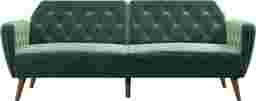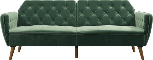 The Telora II Memory Foam Futon is exactly what you need and more. Bringing elegance and sophistication into your home with its vintage silhouette, rounded lines and button-tufted details. Designed with a soft velvet upholstery, this piece of furniture is both compact and multi-functional. Made with a sturdy wood frame, it is designed to offer nothing but superior comfort. The seat cushions are filled with high-density foam and responsive memory foam that will cradle your body to help relieve pressure points while you are watching TV or taking a much needed afternoon nap. The backrest features a split-back design that can be independently reclined to convert between multiple positions sitting, lounging and sleeping. In other words, this means that you will now have an extra bed for overnight guests. The futon is finished with slanted wooden legs to add a last touch of chic style. Customer assembly is required.