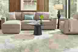 The world quiets... life's rhythms slow... serenity washes over you as you gently relax into the Tempo Modular collection, its effortless luxury flowing from the unity of form and function. Transitional style defines this sectional, its comfortably understated seats upholstered in beige chenille and highlighted with unique inverted waterfall track arms. The storage ottoman provides extra space for blankets and pillows. And, with easy-to-use connectors, this modular seating solution can be rearranged to fit your changing needs and tastes. Includes LAF chair, armless chair, RAF chair and storage ottoman. Upholstery: 100% Polyester. Small accent pillow not included.