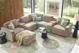 The world quiets... life's rhythms slow... serenity washes over you as you gently relax into the Tempo Modular collection, its effortless luxury flowing from the unity of form and function. Transitional style defines this sectional, its comfortably understated seats upholstered in beige chenille and highlighted with unique inverted waterfall track arms. Two media seats conceal bluetooth-enabled speakers, while the console features a subwoofer. Each speaker syncs with one another and your TV or phone, providing unbelievable surround sound. Media control panels set into the console and the arm of each media seat offer USB-A and USB-C charging as well. Adding to the convenience, the console also has storage and two hidden cupholders. And, with easy-to-use connectors, this modular seating solution can be rearranged to fit your changing needs and tastes. Includes LAF media chair, 2 media consoles, 2 armless chairs, wedge seat, RAF media chair and storage ottoman. Upholstery: 100% Polyester.