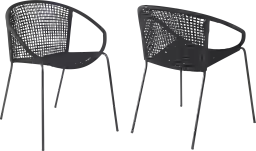 The set of 2 Terela indoor/outdoor steel dining chair with black rope is a wonderfully intricate and fun design that will bring a unique aesthetic to your outdoor living space. Featuring an elaborate woven design and durable metal frame, this chair will blend seamlessly into your outdoor decor. The wide seat and back offer ample room for seating, creating an absolutely divine seating experience. This outdoor chair features a weather-resistant regatta cording tightly crosshatches the entire seat and back, providing supportive comfort so you enjoy time around the table with loved ones, also enhancing your seating experience with a softness that rivals most fabrics. Each chair is made with the best craftsmanship, with these chairs standing on top of durable metal legs in a black finish for a modern look. Customer assembly is required.