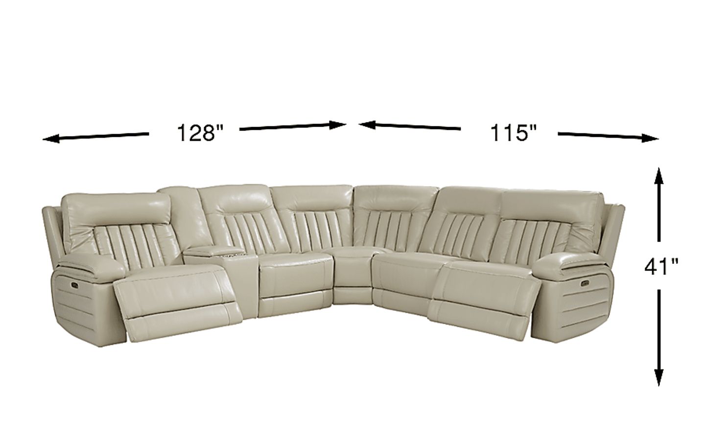 Lean into comfort with the transitional style of the Terenzo sectional. Upholstered in top grain leather where the body touches in beige, this sectional offers seating for up to five adults. Three dual power recliners allow you and your guests to adjust the headrests and footrests at the touch of a button. To conveniently charge your devices, USB ports are built into the console and each end. The console also features two cupholders and lift-top storage for stowing away remotes, glasses and more. Channeling detail and soft double padded arms add the finishing touches to this luxe collection. Upholstery: Top grain leather where the body touches and polyurethane fabric sides and backs.