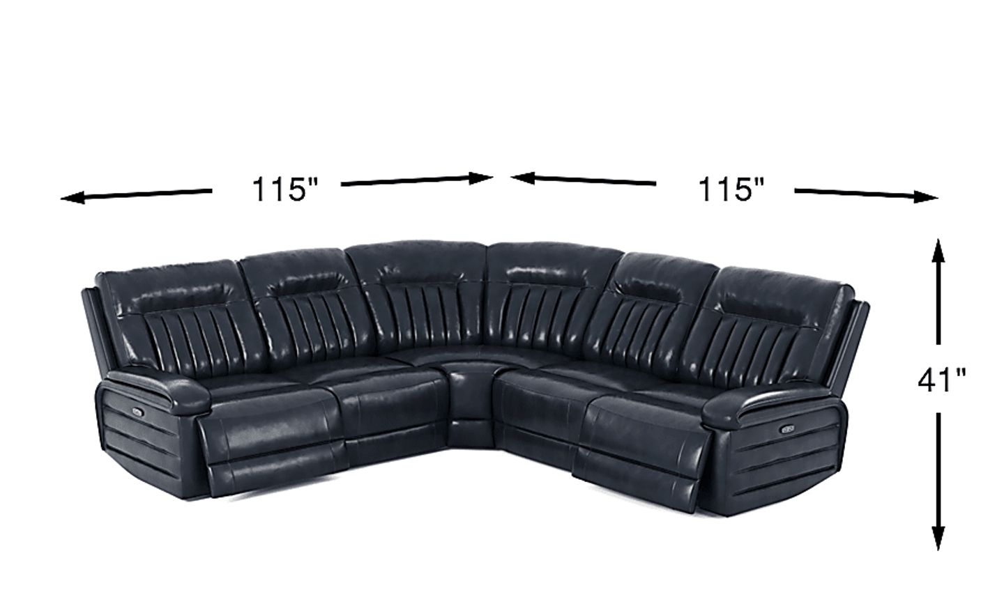 Lean into comfort with the transitional style of the Terenzo sectional. Upholstered in top grain leather where the body touches in blue, this sectional offers seating for up to five adults. Three dual power recliners allow you and your guests to adjust the headrests and footrests at the touch of a button. To conveniently charge your devices, USB ports are built into each end. Channeling detail and soft double padded arms add the finishing touches to this luxe collection. Upholstery: Top grain leather where the body touches and polyurethane fabric sides and backs.