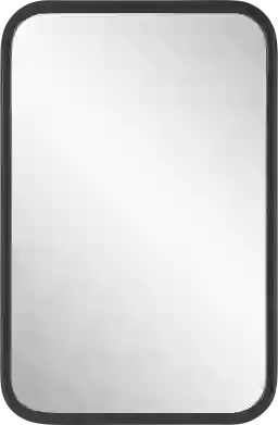 This Terina contemporary rectangular mirror features rounded corners, offering a softer, more refined silhouette that contrasts beautifully with its bold matte black finish. The front profile of the frame showcases a distinctive step-down from the outer frame to a flat, streamlined inner frame, adding depth and visual impact. This mirror is perfect for adding a touch of modernity and style to any room.