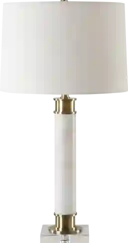 Crafted from white marble with subtle veining, the Terrell Isle White Lamp is displayed on a thick crystal foot, complemented by plated antique brass accents. A slightly tapered hardback shade in a crisp white linen fabric complements the piece. Partial assembly may be required.