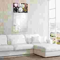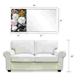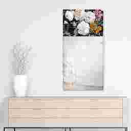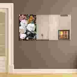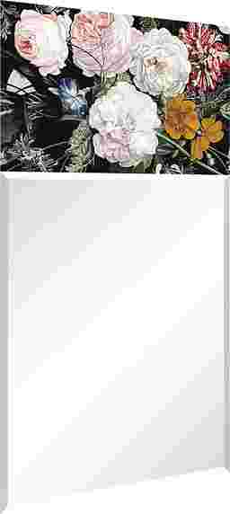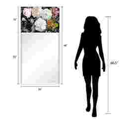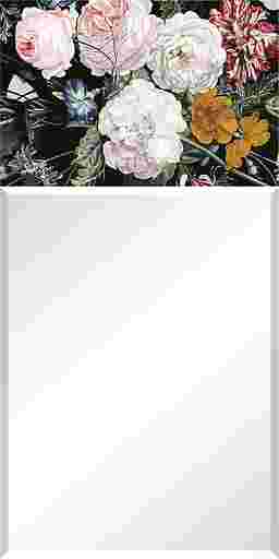 The Tesia mirror is a frame-less, free floating, tempered glassthat was inspired by the French technique of Verre Eglomise in which artist's literally painted the back of clear glass so that when viewed from the front the painting is brought to life under the depth of the glass. This piece of pretty flowers takes that same tempered glass and displays a beveled mirror in front of it. Two strong steel hangers are attached to the back of the mirror for a quick and easy vertical installation.