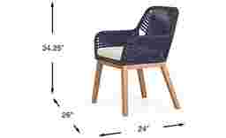 Intricately woven with contemporary flair, the Tessere dining arm chair is a stylish choice for any outdoor space. This chair features a rustproof aluminum bucket seat wrapped in blue, marine-grade polypropylene rope with UV inhibitors. Offering the perfect seat for mealtimes, a beige cushion upholstered in high performance outdoor fabric adds a touch of class. Four legs made from solid eucalyptus complete this stool's sleekly crafted style profile.
