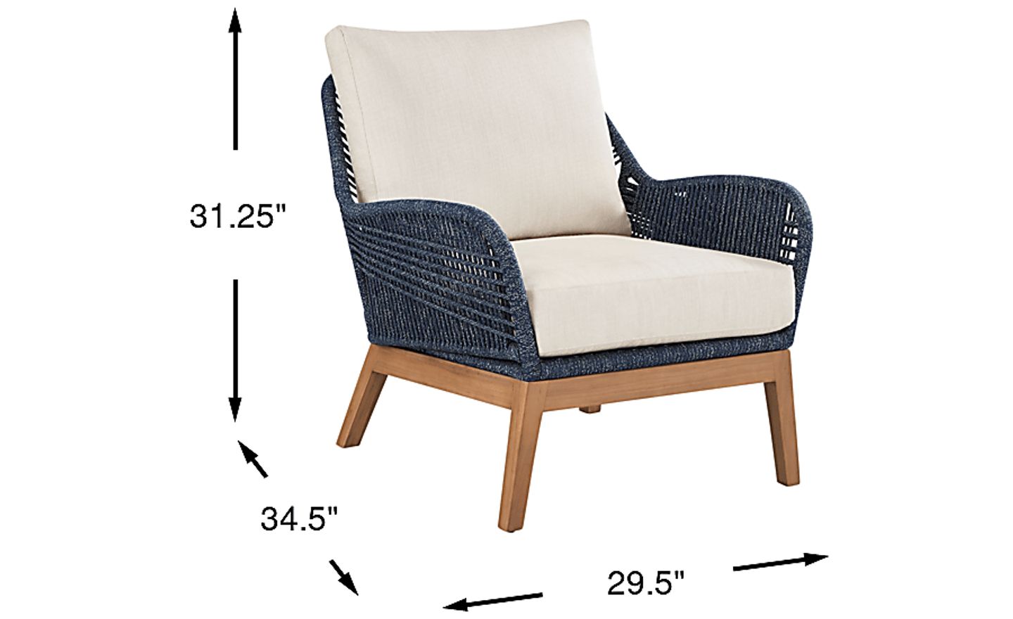 Intricately refined with contemporary flair, the Tessere club chair is a stylish choice for any outdoor space. With legs and a base made of solid eucalyptus, this piece features rustproof aluminum bucket seats and arms wrapped in marine-grade polypropylene rope in blue for exquisite style. Beige cushions upholstered in outdoor performance fabric offer the perfect final touch.