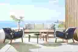Intricately refined with contemporary flair, the Tessere club chair is a stylish choice for any outdoor space. With legs and a base made of eucalyptus solids, this piece features rustproof aluminum bucket seats and arms wrapped in marine-grade polypropylene rope in blue for exquisite style. Beige cushions upholstered in outdoor performance fabric offer the perfect final touch.