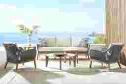 Intricately refined with contemporary flair, the Tessere seating set is a stylish choice for any outdoor space. Each piece features rustproof aluminum seats and arms wrapped in gray marine-grade polypropylene rope for exquisite style. Beige cushions upholstered in outdoor performance fabric offer the perfect touch of durable softness. To finish the look, two matching chairs provide plenty of extra room to relax. Cocktail table not included.