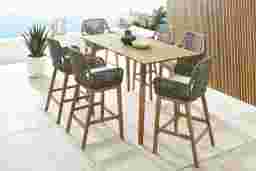 Intricately refined with contemporary flair, the Tessere bar height dining set is a stylish choice for any outdoor space. Crafted from solid eucalyptus in a natural finish, the rectangle dining table has a plank top design with a capable umbrella hole. Six coordinating barstools with legs made of eucalyptus solids feature rustproof aluminum bucket seats wrapped in gray, marine-grade polypropylene rope for exquisite mealtime style. Beige cushions upholstered in outdoor performance fabric offer the perfect final touch.