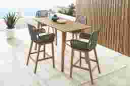 Intricately refined with contemporary flair, the Tessere bar table is a stylish choice for any outdoor dining space. Crafted from solid eucalyptus in a natural finish, this bar height dining table features a plank top design with ample room for mealtimes. An umbrella hole at the center of the 75" rectangular table can be capped when not in use.