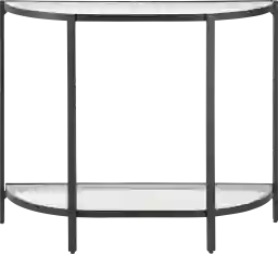 Featuring a sleek demilune frame that spans 36" wide, this Tharo iron console table blends style and function. The satin black finish exudes a contemporary elegance and the shelves are crafted with tempered glass, offering a durable surface for displaying your favorite decor. Customer assembly required.