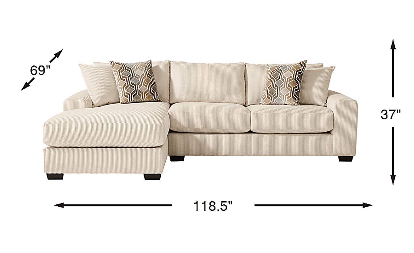 Put the day aside, let worries fade and ease back into luxe relaxation as the The Challenge sectional from Drew & Jonathan Home becomes your haven of soft texture, calming color and soothing comfort. Cozy corduroy in cream beige graces every curve, accentuating the plush seats and wide track arms with casual contemporary style. Deep seats encourage lingering conversations and the occasional afternoon nap, while reversible cushions make it simple to keep the look fresh and inviting. The extra-wide chaise is designed for downtime, delivering lots of extra legroom. Coordinating pillows complete the look with a generous touch of adjustable comfort. Upholstery: 100% Polyester. Cleaning Instructions: Use water-based cleaning agents or foam.