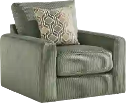 Put the day aside, let worries fade and ease back into luxe relaxation as the The Challenge swivel chair from Drew & Jonathan Home becomes your haven of soft texture, calming color and soothing comfort. Cozy corduroy in sage green graces every curve, accentuating the plush seat and wide track arms with casual contemporary style. The deep seat encourages lingering conversations and cozy relaxation, while reversible cushions make it simple to keep the look fresh and inviting. A swivel base adds soothing motion to the sitting experience. A coordinating pillow completes this look with a generous touch of adjustable comfort. Upholstery: 100% polyester.