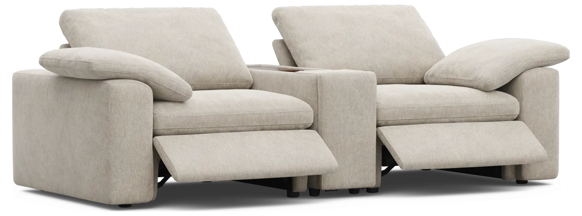 The center console is designed as a functional hub for the modern living room. It features a sliding tabletop that reveals a hidden storage compartment, perfect for keeping remote controls and tablets organized. For device management, it includes lighted USB charging ports, ensuring your electronics stay powered during movie marathons. Additionally, the console features discrete, hidden cupholders that maintain the sectional’s sleek, contemporary aesthetic when not in use.