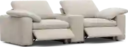 Quiet confidence takes shape, and unwinding feels as natural as breathing with The Flow from Drew & Jonathan, a collection that turns everyday lounging into a quiet ritual of calm and connection. Wrapped in soft gray chenille, this contemporary sectional rests on a cloud-like foundation of deep, oversized seating and gently rounded radius arms topped with loose cushions for an added layer of softness. Dual power reclining offers the perfect angle of comfort with easy adjustment to the footrests and headrests. The included console adds thoughtful function with sleek hidden cupholders, a brown sliding tabletop that reveals concealed storage, and lighted USB charging for a delightful modern touch. Upholstery: 100% Polyester. Accent pillows not included.