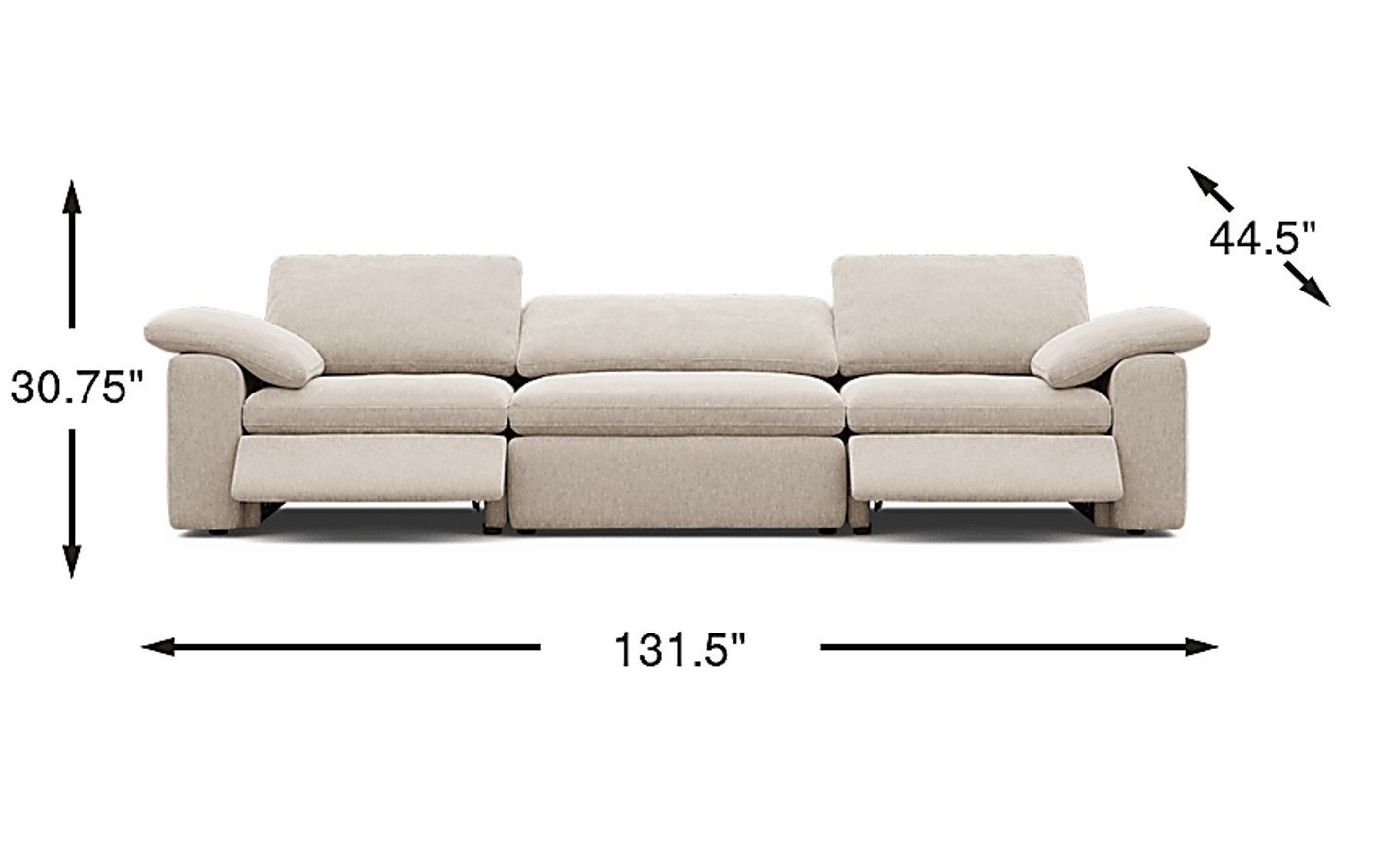 This sofa features an expansive width of 131.5 inches, making it a substantial anchor piece for large living rooms or open-concept spaces. When planning your layout, ensure you have enough clearance for the dual power mechanisms; you will need several inches of space behind the pillow back for the recline and ample room in front for the footrests to extend fully. Measuring your entryways and hallways is also essential, although the 3-piece modular design helps simplify the delivery process through standard doors.
