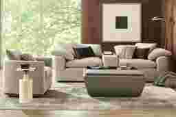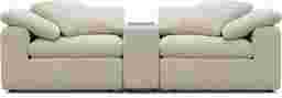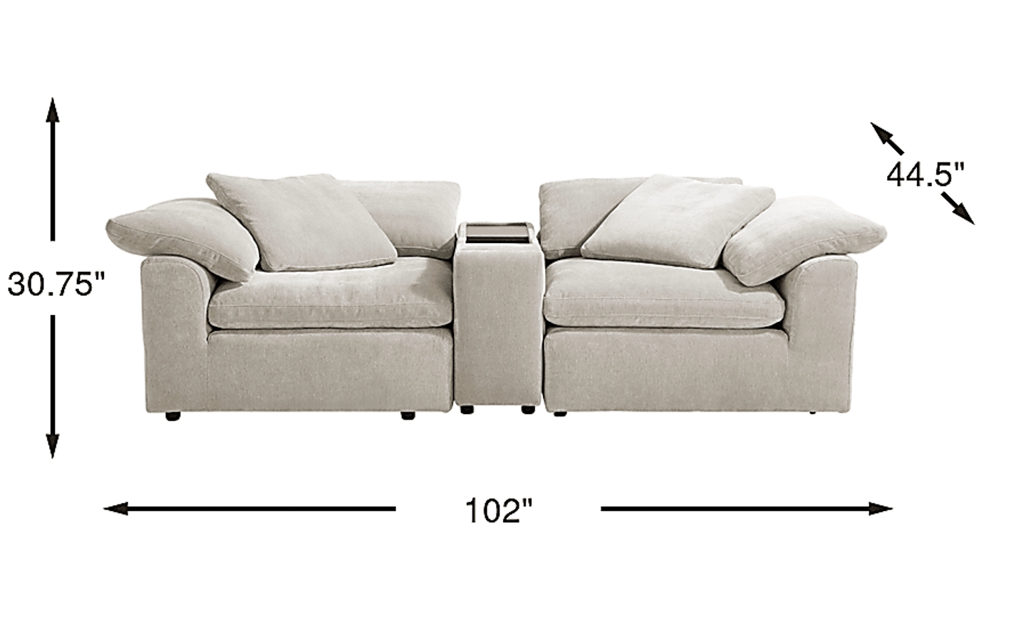Quiet confidence takes shape, and unwinding feels as natural as breathing with The Flow from Drew & Jonathan, a collection that turns everyday lounging into a quiet ritual of calm and connection. Wrapped in soft gray chenille, this contemporary sectional rests on a cloud-like foundation of deep, oversized seating and gently rounded radius arms topped with loose cushions for an added layer of softness. The included console adds thoughtful function with sleek hidden cupholders, a brown sliding tabletop that reveals concealed storage, and lighted USB charging for a delightful modern touch. Upholstery: 100% polyester. Accent pillows not included.