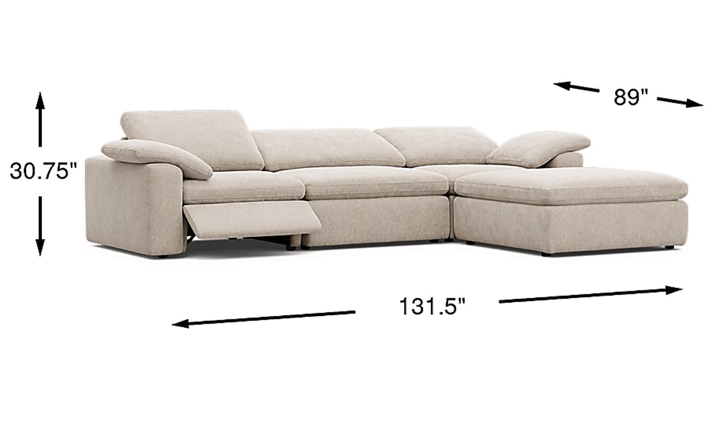 With a total width of 131.5 inches, this is a full-scaled sectional designed to maximize seating. While it provides an expansive "cloud-like" lounging area, it is essential to measure your space and delivery path—including doorways and hallways—carefully. Because it is a 4-piece modular configuration, the individual sections are typically easier to navigate through narrow entryways than a single-piece sofa of the same size.