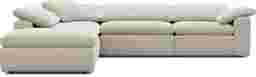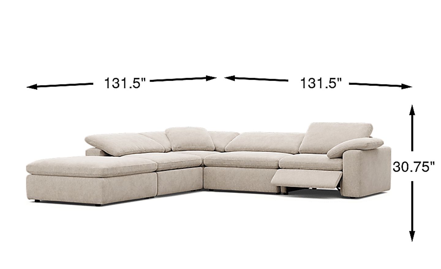 Quiet confidence takes shape, and unwinding feels as natural as breathing with The Flow from Drew & Jonathan, a collection that turns everyday lounging into a quiet ritual of calm and connection. Wrapped in soft gray chenille, this contemporary sectional rests on a cloud-like foundation of deep, oversized seating and gently rounded radius arms topped with loose cushions for an added layer of softness. Dual power reclining offers the perfect angle of comfort with easy adjustment to the footrests and headrests, while the bumper ottoman adds extra space to stretch out. Upholstery: 100% polyester. Dual power RAF recliner, armless chair, corner wedge, bumper ottoman.