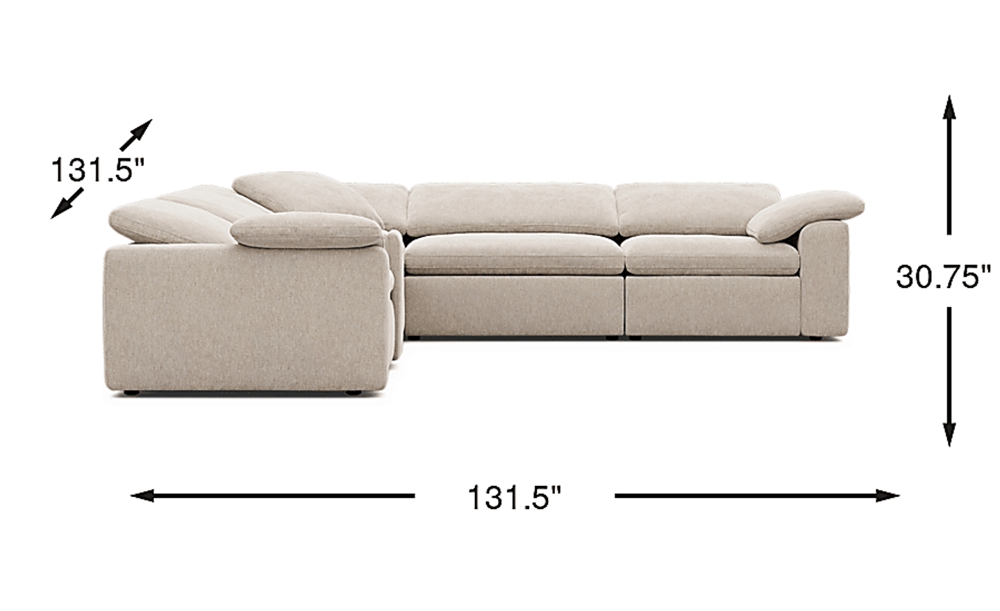 While this sectional has a substantial footprint of 131.5" x 131.5", it is delivered in five separate pieces. Based on our expertise with reclining furniture, these units typically feature removable backrests, which significantly reduces the profile of each piece. This design allows the sectional to be maneuvered more easily through standard doorways and into tight living room layouts.