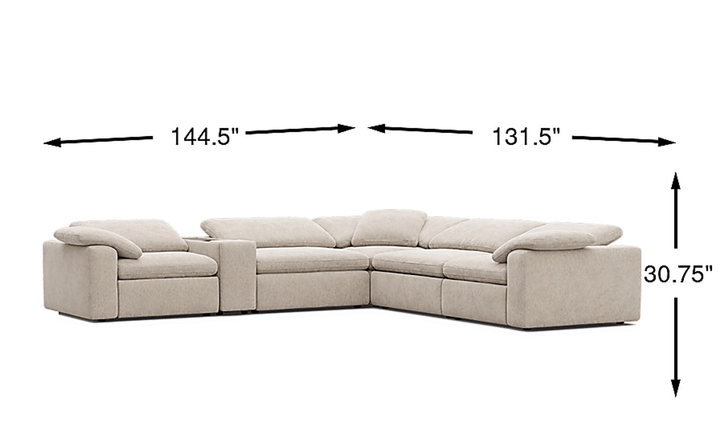 With dimensions of 144.50"w x 131.50"d, this 6-piece sectional is designed for spacious environments such as large suburban family rooms, finished basements, or open-concept living areas. Its substantial footprint provides a "cloud-like" lounging experience, but we recommend measuring your floor plan carefully to ensure at least 30 inches of walking space remains around the perimeter of the furniture.