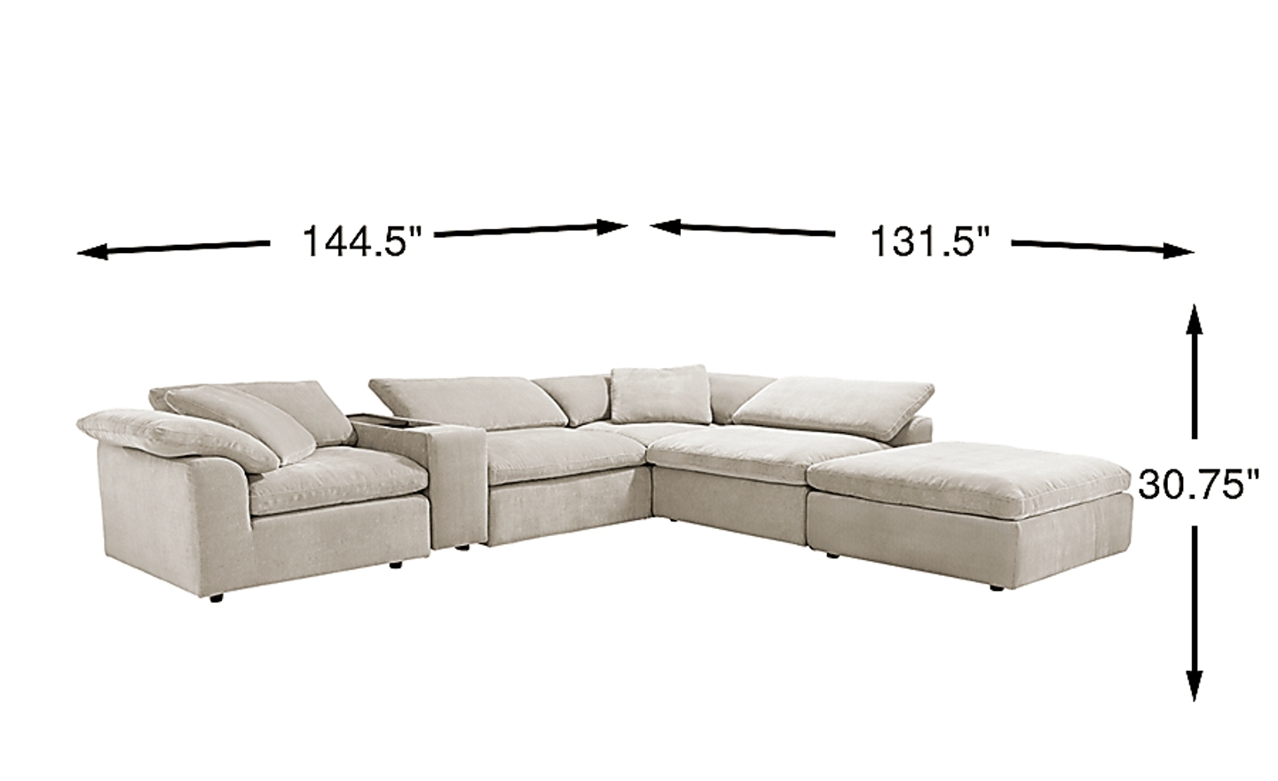 With a footprint of approximately 144.5"w x 131.5"d, this is an expansive furniture piece best suited for large great rooms or spacious open layouts. Its modular 6-piece construction is a significant advantage for delivery, as the individual sections can be navigated through standard-sized doorways and hallways more easily than a large, single-frame sofa. We recommend measuring your space and considering the 30.75-inch height to ensure it fits comfortably under windows or wall-mounted decor.
