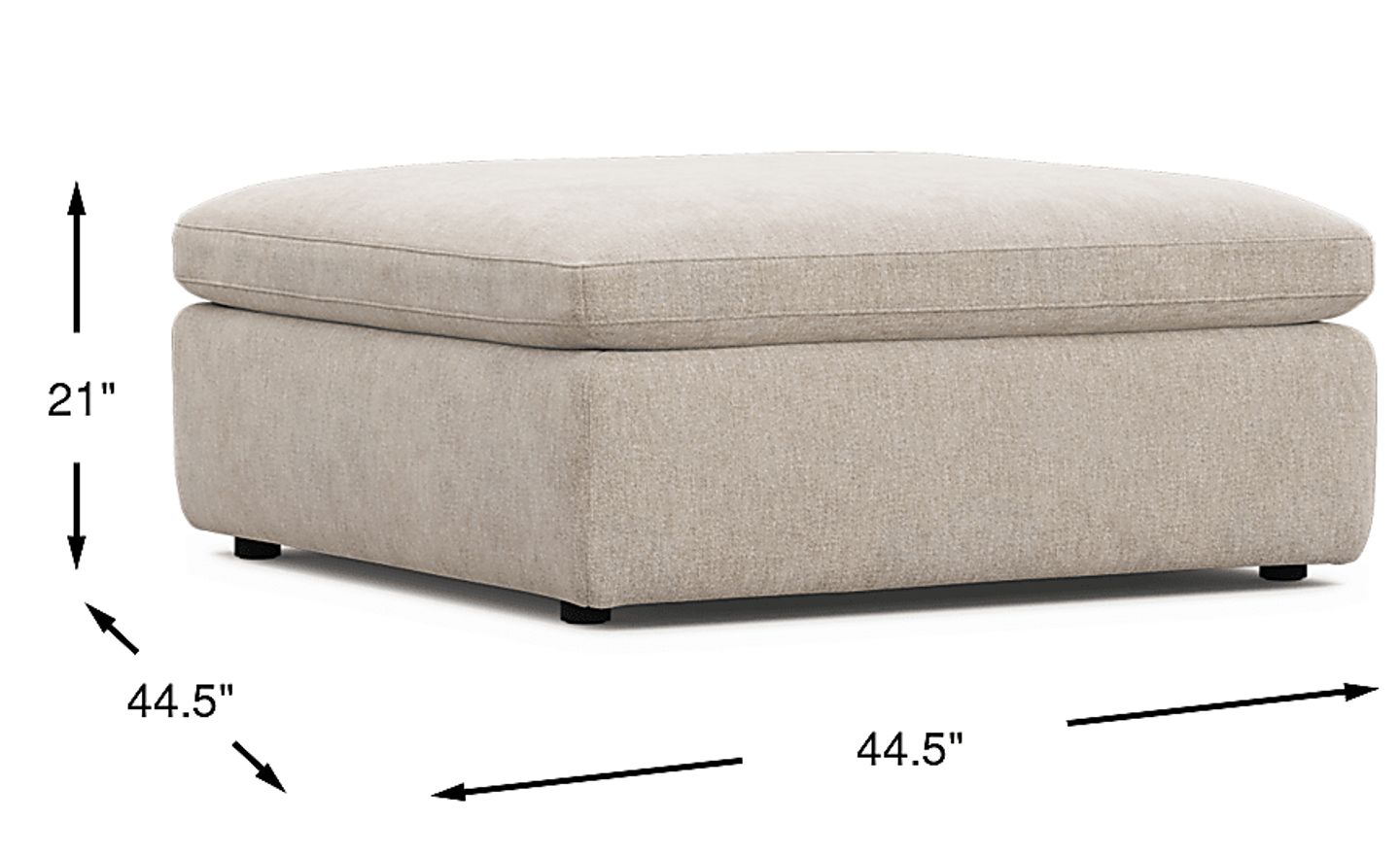 With a 44.5-inch square footprint, this ottoman is designed to anchor substantial seating arrangements. Our design standards suggest that a central ottoman should ideally measure between one-half to two-thirds the length of your sofa’s main section. At 21 inches tall, the height is engineered to align with most contemporary seat cushions, ensuring an ergonomically comfortable transition when used as a footrest.