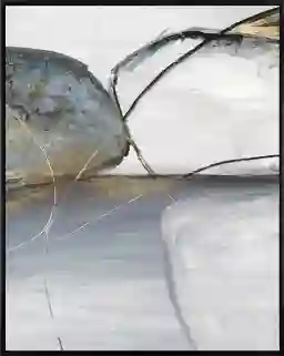 The Stones I form are displayed in a geometric pattern. Canvas is mounted in a satin black floater frame. Customer assembly is required.
