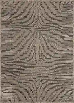 The Thebe jungle animal transitional flatweave area rug features a neutral background with grey tweed zebra stripes creating a visually interesting geometric pattern. Vacuum regularly. Sponge spots to clean. To clean full rug, gently rinse with a solution of mild detergent and water, then hose rug clean. Reducing exposure to rain and moisture will prolong rug life. Use of a rug pad is recommended.