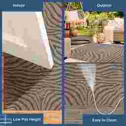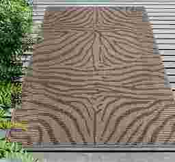 The Thebe jungle animal transitional flatweave area rug features a neutral background with grey tweed zebra stripes creating a visually interesting geometric pattern. Vacuum regularly. Sponge spots to clean. To clean full rug, gently rinse with a solution of mild detergent and water, then hose rug clean. Reducing exposure to rain and moisture will prolong rug life. Use of a rug pad is recommended.