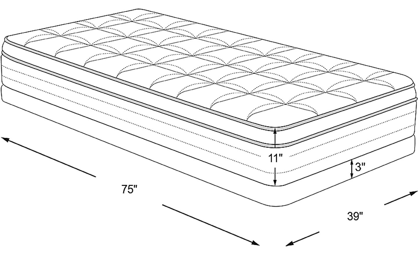 mattress: 75"l x 39"w x 11"h, foundation: 3"h