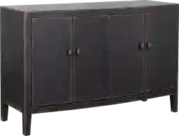 This Thrall I credenza brings a vintage aesthetic to your dining or living room. The textured midnight black and brown finish is purposefully distressed for a slightly weathered, lived-in look. Store everything from dinnerware to crafts in its two double-door cabinet spaces, each with an adjustable interior shelf. Display your favorite decor, family photos, artwork, or rewards on the spacious top to complete your new stylish look. Customer assembly is required.