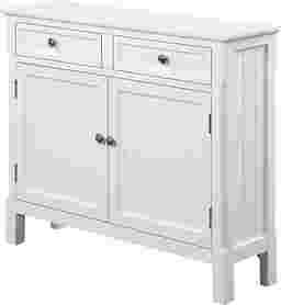 Bead board detailing and a crisp white finish with silvery hardware all come together on this delightful Thronvine accent cabinet for a fresh, clean appearance that will brighten up any dcor. Ideal for your guest bath, where you will be able to store those extra towels on the shelved interior, and extra soaps and lotions in the two upper drawers. Add a vase of fresh flowers on top and maybe a candle or two, and you will have created a lovely oasis for you or your guest! Customer assembly is required.