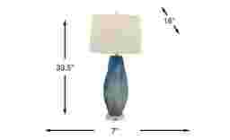 Whether your home has coastal or contemporary decor, the Tibby lamp will be a beautiful addition. The body of the lamp is made of sand blasted glass rendered in soft shades of blue and gray in a matte finish. The freeform glass style has subtle and graceful movement while the natural colored drum shade adds the perfect topper. A three-way switch accommodates up to a 100 watt bulb (not included).