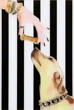 A very striking piece, the Time For A Snack artwork uses vertical stripes and a tall canvas to demonstrate the height difference between dog and owner. The literal hand that feeds descends down to meet the bright-eyed dog, but the two are also matched by their love of all things bling. The 'loved' text in the dog treat surely says it all- this is a great image for fashionable dog lovers anywhere.