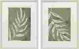 Tiyana is a set of two green and beige palm frond prints are double matted in white. They are framed in a distressed whitewash finish molding. Customer assembly is required.