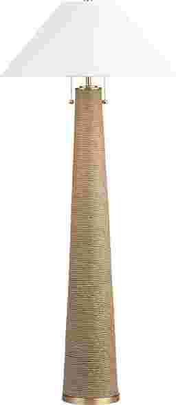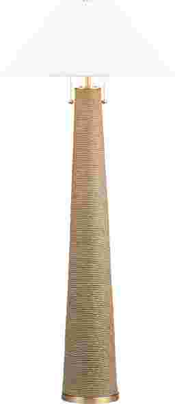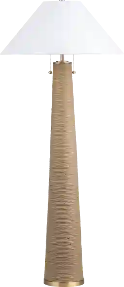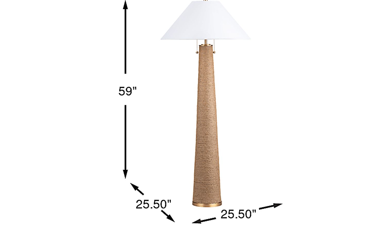 With grace and poise, the ascending conical shape of the Tobias floor lamp is accentuated by its seaside spirit, infusing quiet moments with the easygoing charm of a beach resort. This casual coastal accent features a crisp white shade over a pillar base wrapped in light brown rope. A metal foot in a brass finish completes the look with refined shine.