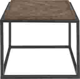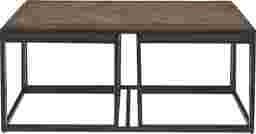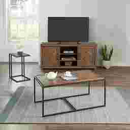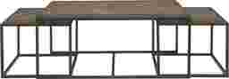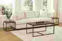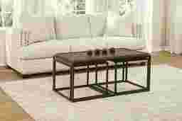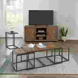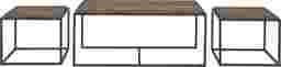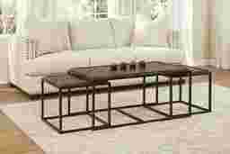 The Toiya bunching cocktail table blends transitional, industrial and rustic styles to create a unique and functional cocktail table set. This collection features one large coffee table and two smaller end tables. The two smaller end tables may be used as end, side, or tray tables or nested and stored under the coffee table to save space. The table tops are constructed from solid pine with a "chevron" or "V" pattern on the top with rough-hewn saw cuts. Each top is then inset on a black metal frame that is slightly distressed. Assembled product measures: Coffee Table: 44"W x 24"D x 20"H; End Tables: 20.5"W x 20.5"D x 18"H. Customer assembly is required.