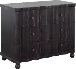 Bring an elegant style to your home with this solid mango wood Toolwrich accent cabinet. The scalloped edges along the top and across the three drawer fronts is highlighted by a distressed black finish. Each drawer features a set of intricately designed metal pulls and sturdy wooden drawer glides. A perfect storage and display companion for dining rooms, entryways, and home offices. Customer assembly is required.