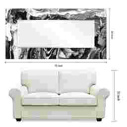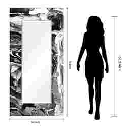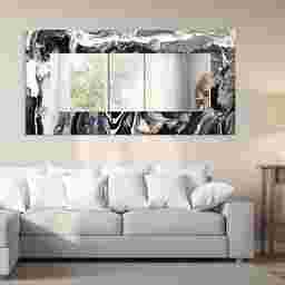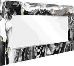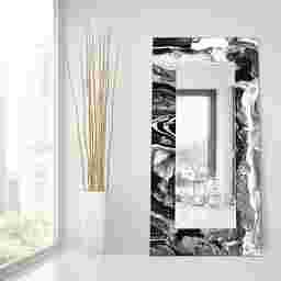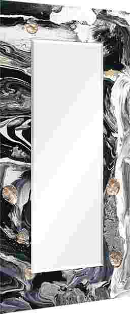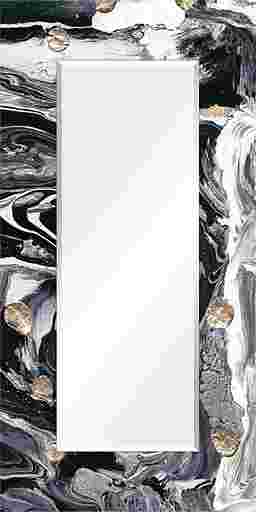 The Toriel mirror is a frame-less, free floating, tempered glassthat was inspired by the French technique of Verre Eglomise in which artist's literally painted the back of clear glass so that when viewed from the front the painting is brought to life under the depth of the glass. This piece of a black and gold abstract takes that same tempered glass and displays a beveled mirror in front of it. Two strong steel hangers are attached to the back of the mirror for quick and easy vertical installation.