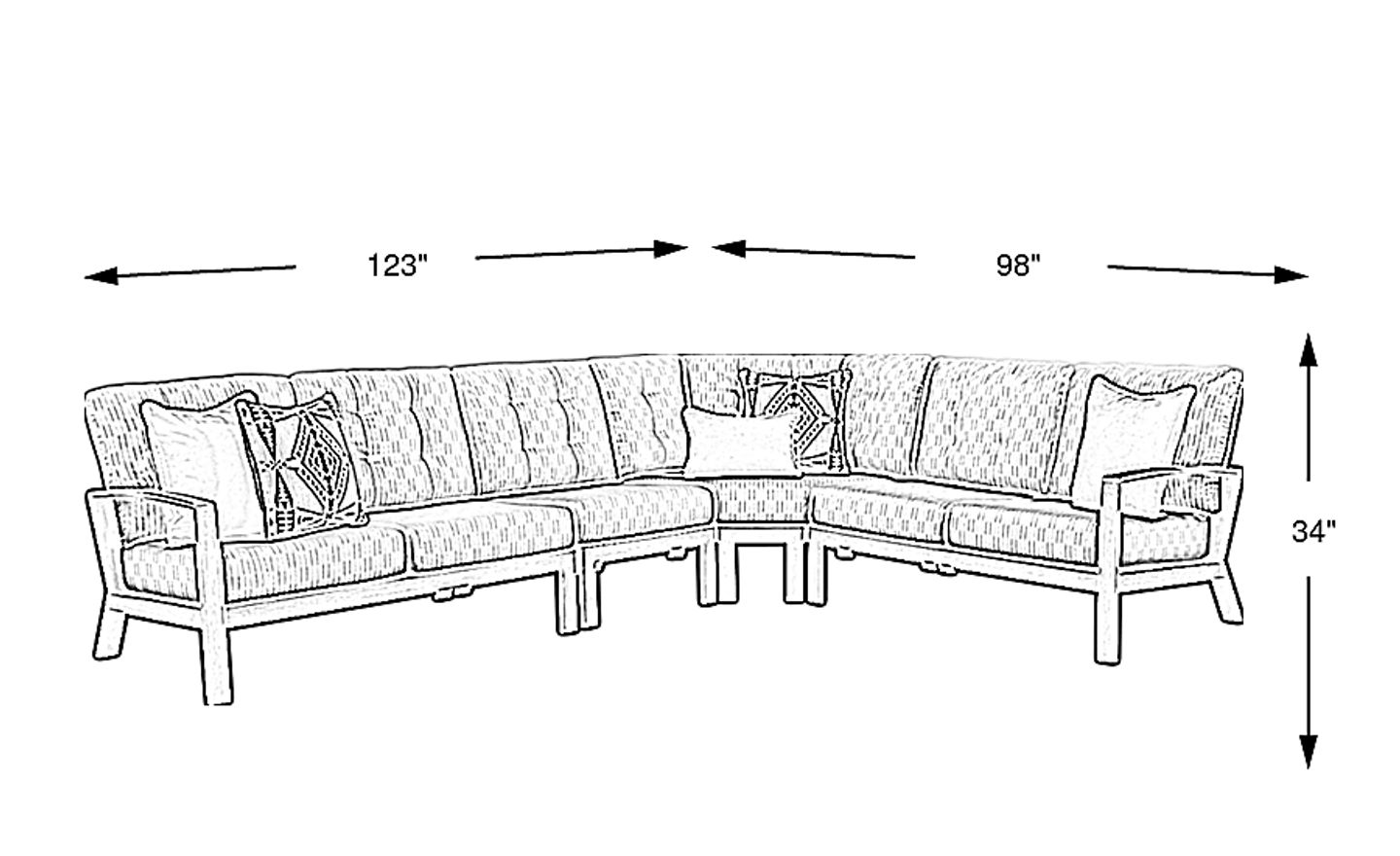 Outdoor relaxation is elevated in stunning style with the Torio sectional's contemporary look and classic feel. Stretch warm afternoon conversations well into the evening on durable, UV-resistant seat cushions in a calming lake blue color. The brown, powder-coated aluminum frame of this 6-seat piece features gently curved arms and pronounced slat-back details. Coordinating accent pillows are included. Select cushion colors also available in Sunbrella fabric.