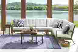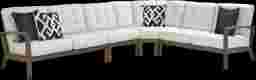 Outdoor relaxation is elevated in stunning style with the Torio sectional's contemporary look and classic feel. Stretch warm afternoon conversations well into the evening on durable, UV-resistant, 100% Sunbrella fabric seat cushions in a calming silk color. The brown, powder-coated aluminum frame of this 6-seat piece features gently curved arms and pronounced slat-back details. Coordinating accent pillows are included. To clean Sunbrella fabric cushions, remove dirt and spray on cleaning solution (water and mild soap) and then use a soft bristle brush or sponge. Allow cleaning solution to soak into fabric and rinse thoroughly until soap residue is removed. Air dry. Do not dry clean.